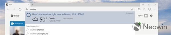 Cortana也可以這么用:在地址欄輸入Weather可以查詢當前的天氣,等等使用場景。