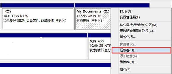 打開磁盤管理,找一個剩余空間較大的分區,右鍵單擊選擇“壓縮卷”: