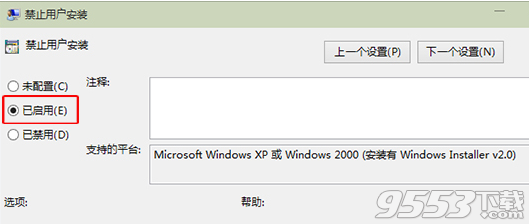 第三步、在禁止用戶安裝界面,點擊選擇“已啟用”后,點擊底部確定即可!