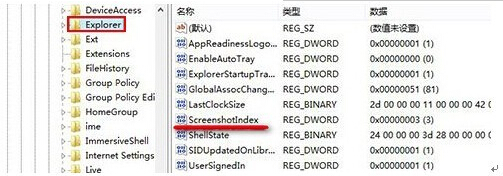 3.在打開注冊表編輯器中,依次展開“HKEY_CURRENT_USERSoftwareMicrosoftWindowsCurrentVersionExplorer”,然后選擇雙擊Explorer文件中的“ScreenshotIndex”選項,如下圖所示