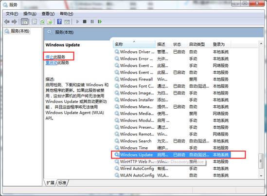 2.在打開的窗口中,找到“Windows Update”并且點擊左上角的“停止服務”停止此服務。如下圖所示