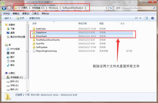 3.關閉服務窗口,點擊打開計算機 – 本地磁盤(系統盤) - Windows – SoftwareDistribution,并且刪除“DataStore”文件夾和“Download”文件夾里面的所有文件,重新啟動電腦重新升級系統更新即可。如下圖所示