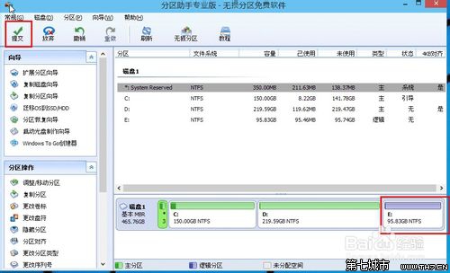 5、合并分區之后E盤有大約95GB。所以操作完成之后,點擊左上角“提交”電腦才會為您進行分區大小調整及分區合并任務。