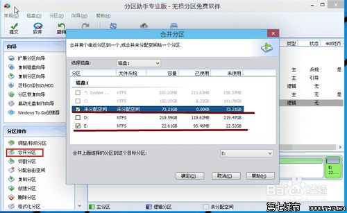 4、如果你還想對這個未分配空間進行利用,我們可以看到E盤空間很小只有大概22GB,這個時候我們就可以把這部分“未分配空間”合并到E盤。首先選中E盤,點擊左邊任務欄的“合并分區”。