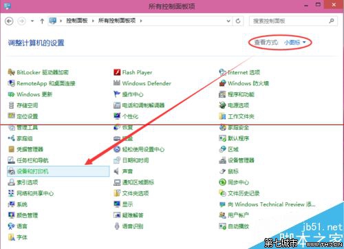 2、將查看類型更改為小圖標,然后點擊“設備和打印機”,如下圖所示。