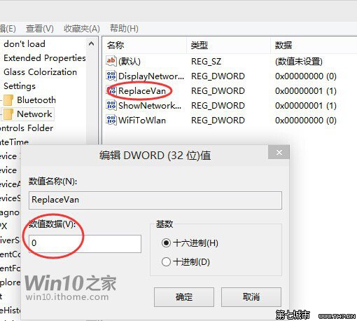 ▲然后再注冊表編輯器里的Network文件夾雙擊“ReplaceVan”,在彈出的窗口中將“數值數據”由默認的1改為0,單擊“確定”退出。