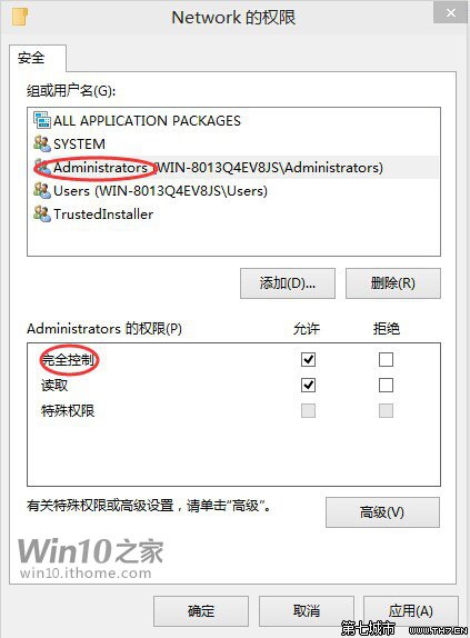 ▲點擊“確定”關閉“Network高級安全設置”窗口后,在“安全”選項卡中選擇“Administrators”(管理員)標簽,確認“完全控制”被鉤選,然后點擊“確定”應用修改。