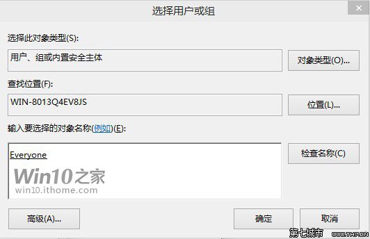 需要注意的是,您可以去控制面板的用戶賬戶里確認準確名稱,輸入之后點擊旁邊的“檢查”按鈕確認是否輸入的用戶名存在:存在的話會自動排版為準確名稱(含下劃線),不存在或者輸入有誤會給出提示。如果是您自己的電腦,怕麻煩的話可直接輸入“Everyone”,讓這個系統的所有用戶得到權限(方便的同時安全性會降低,不過對于預覽版系統不必太在意吧)。