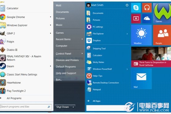 而即便忽略掉動態(tài)磁貼,開始菜單看上去依然不對勁。在默認下,它的色彩會根據(jù)系統(tǒng)主題而變化,但這同時也是Windows10當中唯一會適配系統(tǒng)主題的菜單。把它和Windows7直接對比你就會發(fā)現(xiàn),后者僅更易閱讀,同時也顯得更加緊湊。
