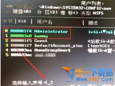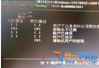 查看你要清除密碼的用戶名。然后把它前面的序號輸入到下面的選擇輸入序號那里。再回車。進(jìn)入下一個界面后再按一下Y