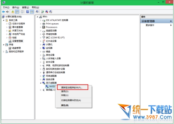 1、打開計算機管理——設備管理器——顯示適配器點擊“更新驅動程序軟件”,如圖所示