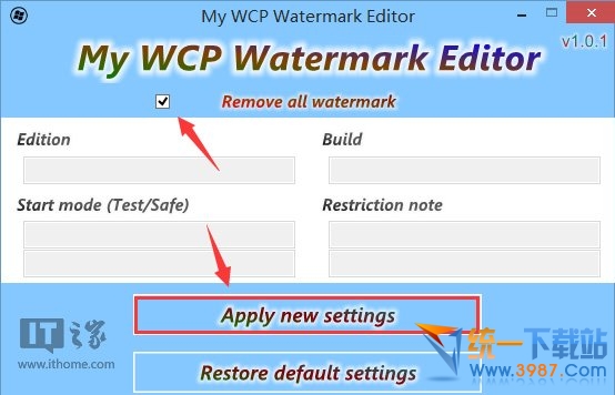 打開工具后,勾選“Remove all watermark”,然后點擊下方的“Apply new settings”即可,如下圖所示。去水印過程中資管管理器會重啟一次,需要一點時間才能完成,請耐心等待。