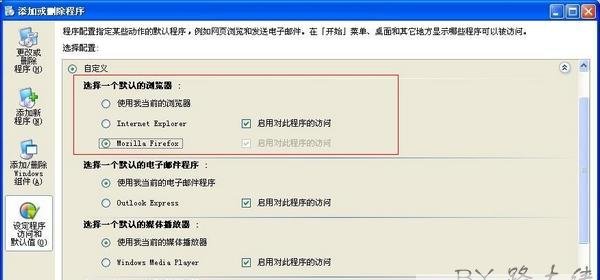 第二步,進入到“設定程序訪問和默認值”后,點擊“自定義”,在“選擇默認的瀏覽器”一項中,選擇一個瀏覽器作為默認瀏覽器,然后點擊確定。