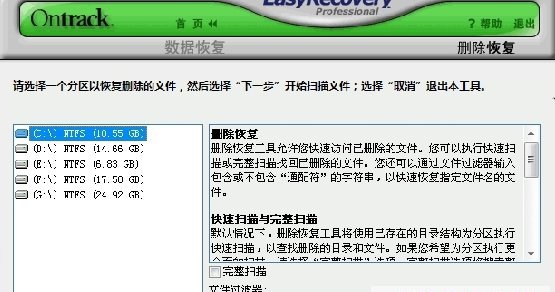 2.在右側選擇任何一種數(shù)據(jù)修復方式都會出現(xiàn)相應的用法提示,如我使用(刪除恢復)項來查找并恢復已刪除的文件時,就會在界面右側出現(xiàn)相應的使用提示。