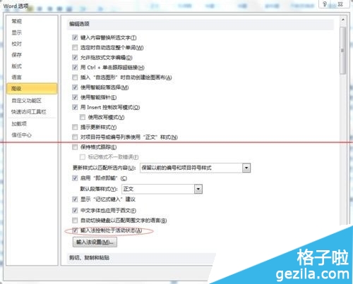 5、在選項窗口中,切換到“高級”,找到圖中紅色圓圈所示的選項(輸入法控制處于活動狀態)設置,去掉勾選。確定。