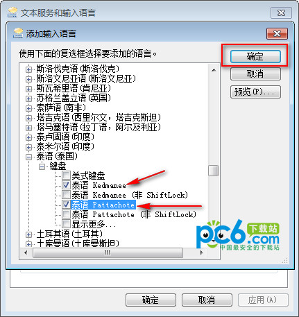 鍵盤配置/輸入法選 "泰文Kedmanee"及"泰文Pattachote"(一次增加一個(gè))——再按確定即可