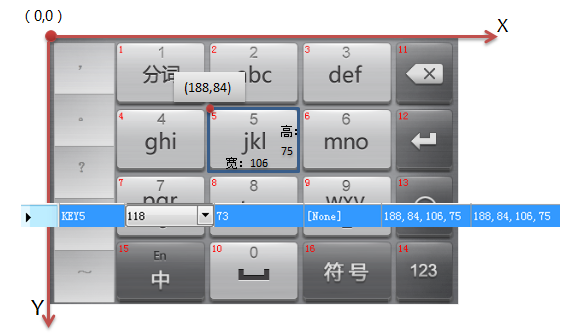 【左上角的X,左上角的Y,寬,高】,通過這四個數值就能將按鍵的位置和大小完整的表現出來,其中面板的左上頂點為原點(0,0),不包括候選字區域。如下圖: