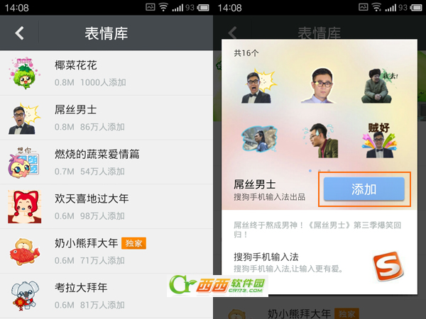 在表情列表中點擊“+”之后,就可以進入搜狗輸入法的表情庫,在表情庫中有很多有趣的表情,點擊喜歡的一個然后點擊“添加”,把表情加入到搜狗輸入法中。
