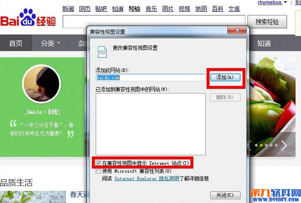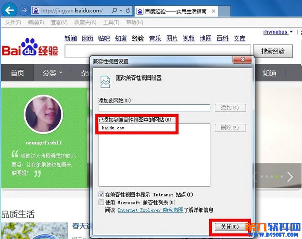 3、添加成功,在兼容性視圖頁面可以看到網站網址,如下圖所示,說明已經設置成功!