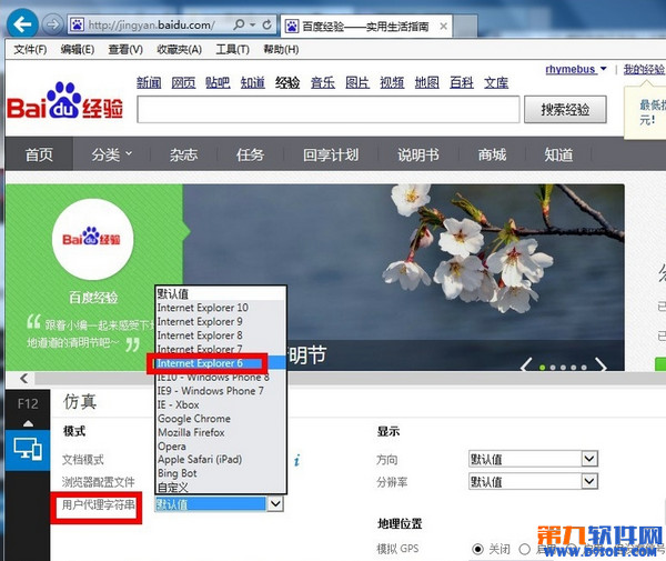 4、在仿真頁面,點擊用戶代理字符串,選擇IE6、7、8任意一個即可!