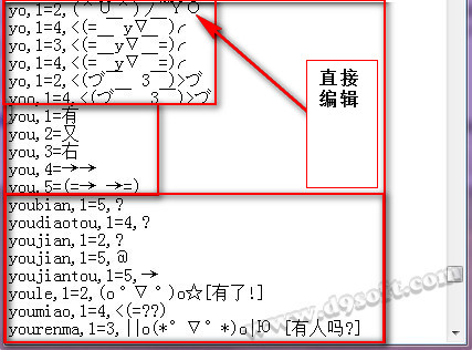 我們來將其編輯為【yo,1=喲】“yo”對應的是我們打出的拼音,“1”是對應的是序號1(用“,”將拼音和序號隔開),“=喲”就是第一個選項的選擇結果了。我們依次排列下去,點擊保存。