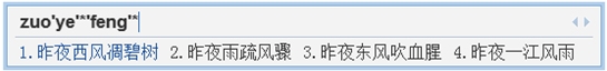 輸入時,可用*號代替部分拼音串,很方便的輸入含有生僻字的詞,或者詩句等,*號代表一個或多個漢字。