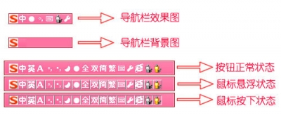 注意事項:標準的導航欄每按鈕切片為16x17像素。可根據制作需求任意設置,但請務必提供完整模式(中、英、A、中文標點、英文標點、全角、半角……),導航欄各按鈕標準上有三種模式(正常、鼠標懸浮,鼠標按下)模式。三種按鈕模式可根據創意進行設計。例圖中提供了標準的三種模式。