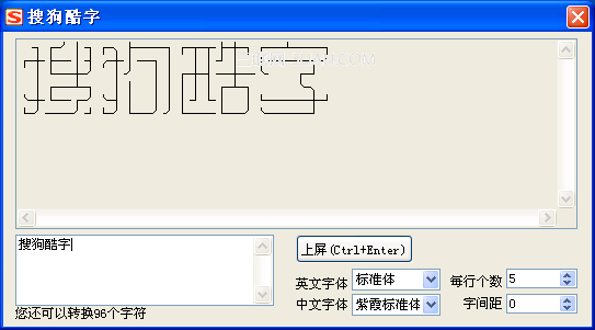 標準模式的窗口有輸入?yún)^(qū)、預覽區(qū)、設置區(qū)。在輸入?yún)^(qū)中的中文,預覽區(qū)會即時顯示效果,在設置區(qū)可以更改字體、字間距和每行的字數(shù)限制。然后點擊上屏即可。