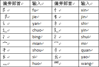 下表列出了常見部首的拼寫輸入: