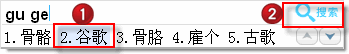 用戶可以在使用谷歌拼音輸入字詞的同時使用 Google 搜索直接搜索候選項。當輸入時,用戶用鍵盤的"上"" 下"箭頭鍵選擇候選字詞,然后按下"Ctrl-G"即可打開搜索網頁。同樣,您可以使用鼠標右鍵點選候選字詞,然后點擊搜索按鈕。例如,如果您要搜索"谷歌",請鍵入"guge",屏幕上將出現: