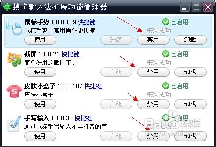 這篇主要是應有人求助怎么關閉,接下來,我介紹一下關閉的方法:首先按照步驟一的方法打開搜狗輸入法擴展管理器。按照下圖箭頭所示,進行禁用就可以了。至于鼠標手勢,我們可以在右下角的任務欄中選擇鼠標手勢圖標,選擇暫?;蛘咄顺鼍涂梢躁P閉了。