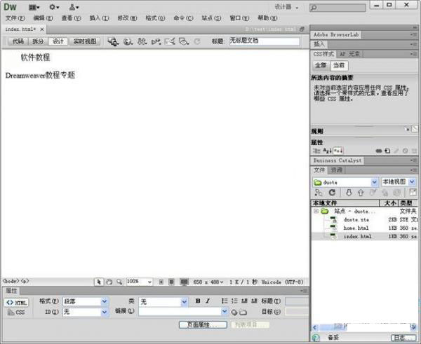 首先我們打開dreamweaver站點中的某個網頁文件,如下圖中打開了index.html文件,在默認情況下,所打開的文件呈現的是設計界面。