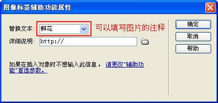 在彈出“圖像標(biāo)簽輔助功能屬性”中,我們可以在“替換文本”中輸入圖片的注釋,如果當(dāng)圖片出現(xiàn)問題不能顯示時,就會出現(xiàn)該說明文字。