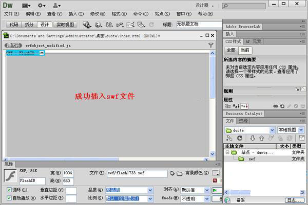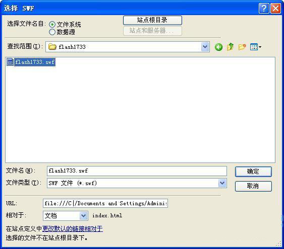 4、找到你要插入的swf文件,然后點擊確定。你可以提前將你的swf文件移至站點中,站點中新建一個swf文件夾,以方便插入。
