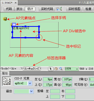 被選中的AP Div在“AP 元素”面板中會高亮度顯示。