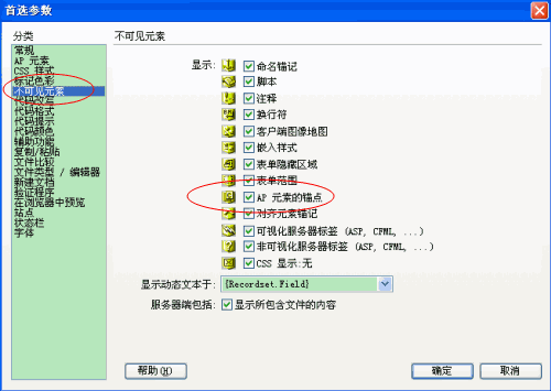 在“分類”下拉列表中選擇“不可見元素”項,在右邊選擇“AP 元素的錨點”項,點擊“確定”按鈕關閉“首選參數”對話框。