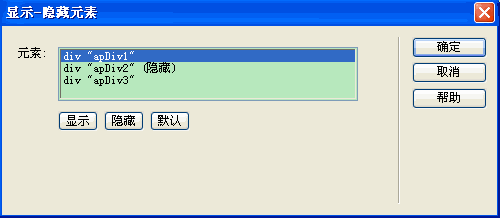 1. 選擇標簽,在“顯示-隱藏元素”對話框中將“div "apDiv1"”設置為隱藏,事件是onLoad。