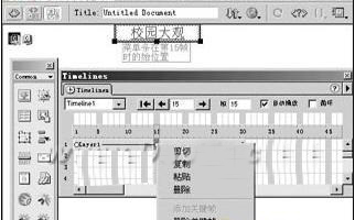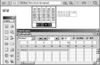 1、選定層面,當(dāng)鼠標(biāo)變成“十”字形時按住左鍵將層面拖動到頁面右上角(使整個菜單條完全露出但上邊緣正好靠攏頁面上邊界),在窗口菜單中打開時間線面板,選定層面將其拖動到時間線上,Dreamweaer會自動產(chǎn)生一個長度為15幀的動畫對象,拖動該動畫對象的最后一個關(guān)鍵幀到第30幀,將其長度設(shè)置為30幀。然后在第15幀處單擊右鍵,在彈出的快捷菜單中選擇“添加關(guān)鍵幀”選項插入一個關(guān)鍵幀,并將層面拖動到適當(dāng)位置(如圖2)。