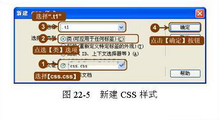 ( 3 )新建并設(shè)置樣式“ .t1 ”。再次單擊【新建樣式】按鈕,在【新建 CSS 樣式】對(duì)話框中點(diǎn)選【類(可應(yīng)用于任何標(biāo)簽)】選項(xiàng),定義自己的樣式類,然后設(shè)置名稱為“ .t1 ”(【名稱】文本框是用來指定類的,用戶可以根據(jù)需要任意填寫,其格式是“ .* ”),最后點(diǎn)選【定義在 css.css 】,一切設(shè)置完畢后單擊【確定】。接下來的設(shè)置跟第二步操作一樣,然后單擊【確定】,如圖 22-5 所示。