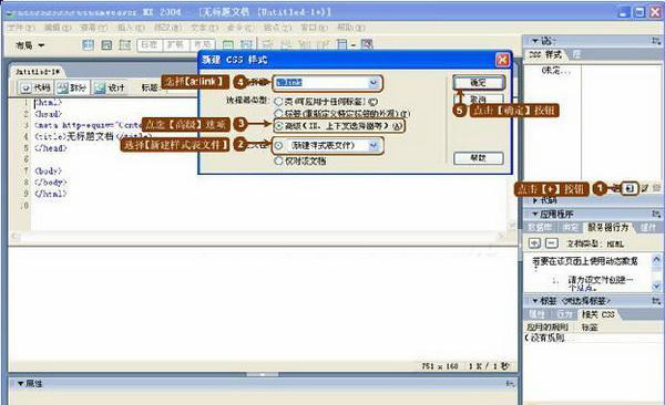 ( 1 )創(chuàng)建一個(gè) CSS 樣式表文件。按下 Shift+F11 鍵打開 CSS 樣式面板,單擊【新建樣式】按鈕,在彈出的【新建 CSS 樣式】對(duì)話框中點(diǎn)選【高級(jí)( ID ,上下文選擇器等)】選項(xiàng),然后在選擇器下拉菜單中選擇【 a:link 】,單擊【確定】按鈕,如圖 22-3 所示。