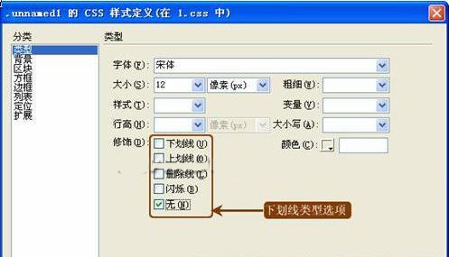 在 CSS 樣式定義設(shè)置對(duì)話框中的“類型”子選項(xiàng)中有 5 種修飾類型。點(diǎn)選不同的修飾項(xiàng),可以輕易設(shè)置不同的初級(jí)鏈接樣式,如圖 22-2 所示。下面以“無”下劃線設(shè)置為例進(jìn)行講解,其他樣式的設(shè)置跟本例類似。
