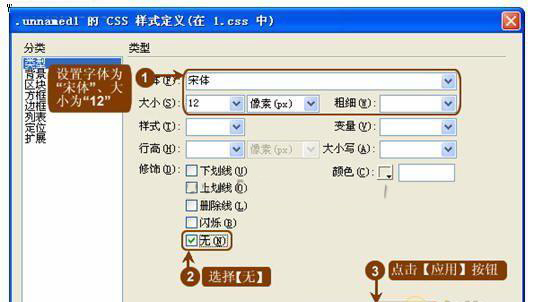 ( 2 )編輯樣式。保存樣式表文件(文件名為 css.css )后,開始編輯樣式。設(shè)定默認(rèn)鏈接樣式為無下劃線,字體為宋體 12pt ,其他色彩等參數(shù)都不設(shè)置,如圖 22-4 所示。
