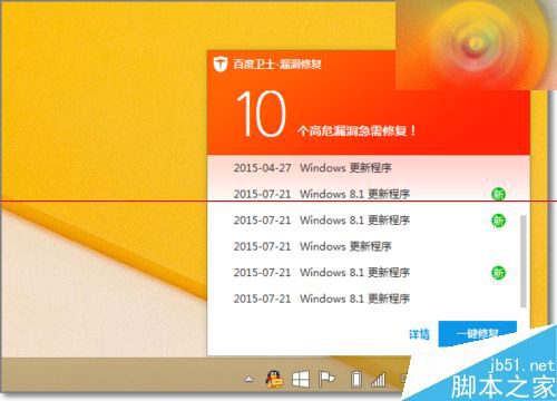 1、在每次開機的時候百度衛士都忘不了提示用戶有哪些高危漏洞急需修復更新。本來這一功能正常情況下來說很好的。