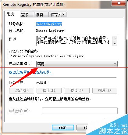 2、在對(duì)話框“常規(guī)→啟動(dòng)類型”處由原來的“自動(dòng)”改為“已禁用”就好了。