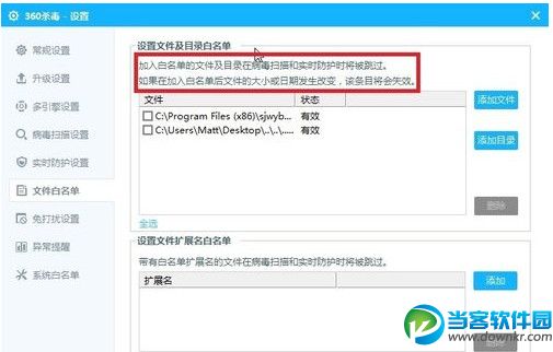 注意 :需要注意一下的是設置——白名單設置中有這么一句話,如果加入白名單的文件大小或日期發生改變,該條目自動失效哦。所以如果更新了的話,很明顯你還得操作一次。