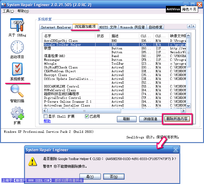 打開 SREng ,到“啟動項目”->“注冊表”,這里顯示了注冊表里大部分啟動項信息,除了常說的run等啟動項外,2.0 RC2新增加了對 ShellServiceObjectDelayLoad 、 SharedTaskScheduler 、 ShellExecuteHooks 、 WinlogonNotify 的檢測,只是對 ShellServiceObjectDelayLoad 、 SharedTaskScheduler 、 ShellExecuteHooks 三類只能進行刪除操作,不能編輯。