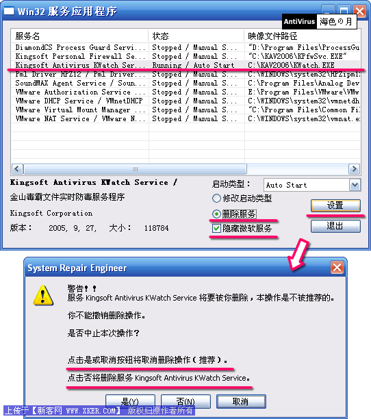 首先在列表中點擊選擇一個需要刪除的服務,然后點選“刪除服務”,再點擊“設置”按鈕,出現警告對話框,請仔細閱讀警告對話框中的內容,確認是否繼續刪除服務的操作,點擊是取消,點擊否確認刪除。