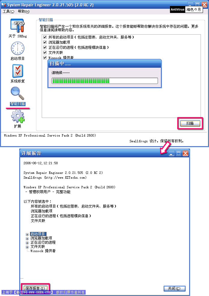 掃描完成后出現“詳細報告”對話框,顯示了掃描結果報告內容,點擊“保存報告”可以保存掃描報告為LOG文件,默認文件名SREngLOG.LOG。