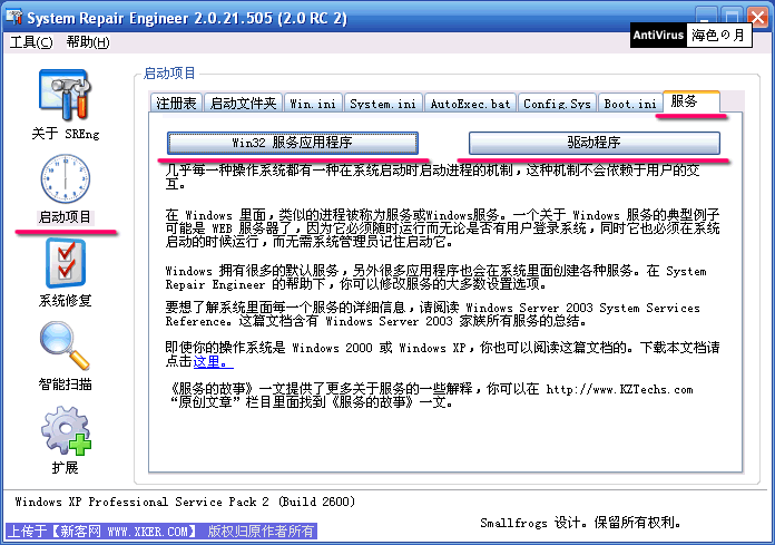 SREng 2.0 RC2 增加了對系統驅動程序服務的掃描,打開 SREng ,到“啟動項目”->“服務”可以看到“Win32應用程序服務”和“驅動程序”兩個按鈕,按下相應按鈕彈出相應服務列表窗口(是可以最大化的窗口哦)。