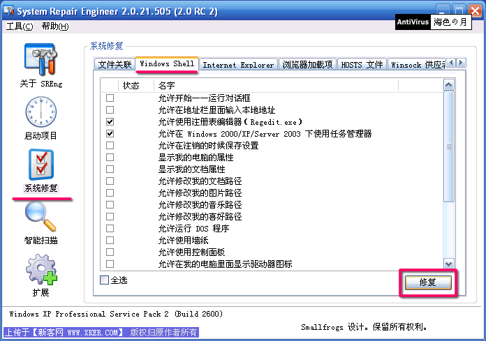 這里列出了一些常見的系統限制項目,勾選需要修復的項目,點擊“修復”按鈕進行修復。